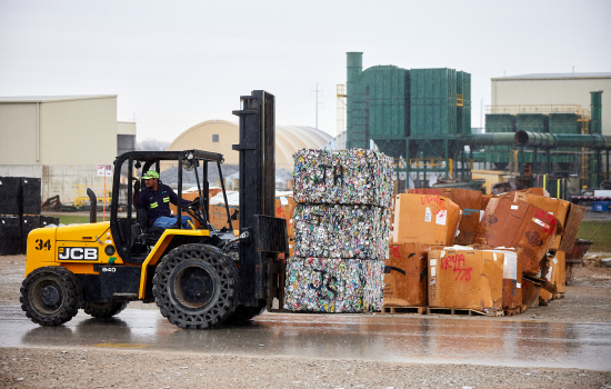 Visual Description: Outside view of the Owl’s Head processing facility, where wheel loaders and trucks are parked in the accompanying lot. Next, a wheel loader carries several blocks of compacted scrap metal through the lot. Then, Travis greets another Owl’s Head employee who is working in the lot.