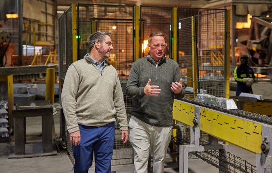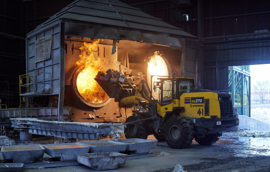 Visual Description: An employee driving a wheel loader brings scrap aluminum across the facility’s lot and inside to be melted down. Next, Craig and Travis are talking to each other in front of the machine melting aluminum.