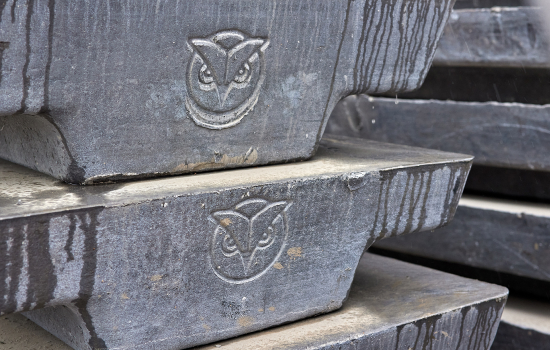Visual Description: Aluminum ingots embedded with the Owl’s Head logo are stacked on top of each other. Next, Travis Jones is seated in an office speaking to the camera.